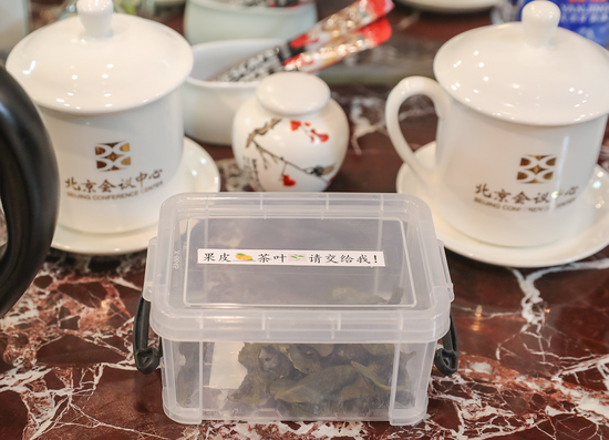 北京会议中心驻地从2019年8月起就开始推行分类措施。北京会议中心垃圾管理办公室主任刘继东介绍,此次全国两会,客房内不再提供一次性用品(包括一次性牙刷、拖鞋、牙膏、香皂、浴液、梳子);会议区设置分类垃圾桶,张贴垃圾分类宣传海报,并减少一次性垃圾袋、纸杯、杯垫的使用。在客房发现,每个房间内都摆放了一本《北京市生活垃圾分类指导手册》,并分别放置“可回收物”和“其他垃圾”两个垃圾桶。为了收集可能产生的厨余垃圾,房间内还放了一个透明小盒子,用于盛放果核、果皮和茶叶残渣。